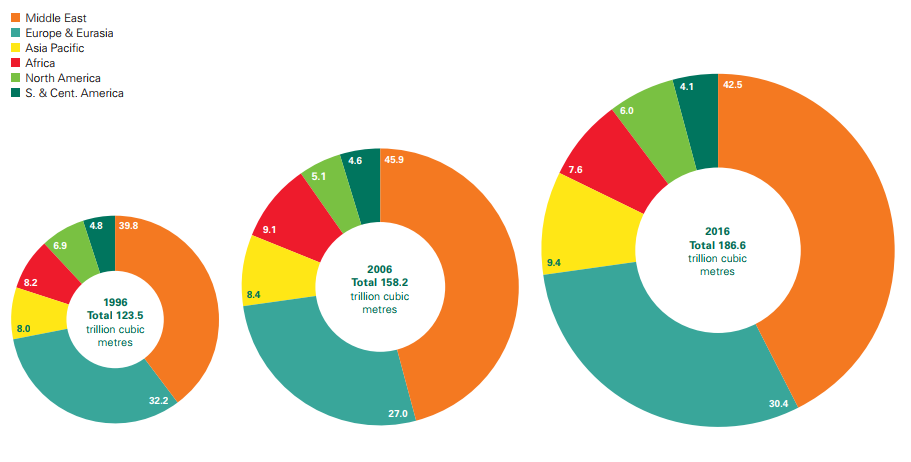 Доказанные запасы природного газа по регионам в 1996, 2006 и 2016 годах (в процентном соотношении):