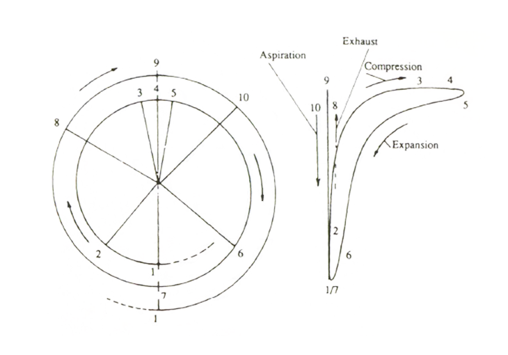 Большинство средне- и высокооборотных главных и вспомогательных судовых дизелей работает по четырехтактному циклу, который осуществляется за 4 последовательных хода поршня или 2 полных оборота коленчатого вала двигателя. Четыре рабочих такта называются: Сжатие; Расширение или Рабочий ход; Выхлоп или ход Впуска; Всасывание или Впуск воздуха. Последовательность рабочих процессов на диаграмме газораспределения: