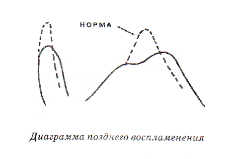 Характерное для этого нарушения изменение формы диаграммы показано на рисунке ниже. Это снижение и смещение значительно позже ВМТ пика давления в цилиндре. Результатом является потеря мощности, так как сгорание топлива происходит не в самой выгодной фазе для совершения работы при движении поршня вниз. Это приводит к потерям производимой энергии, высокой температуре и дымности выхлопа.