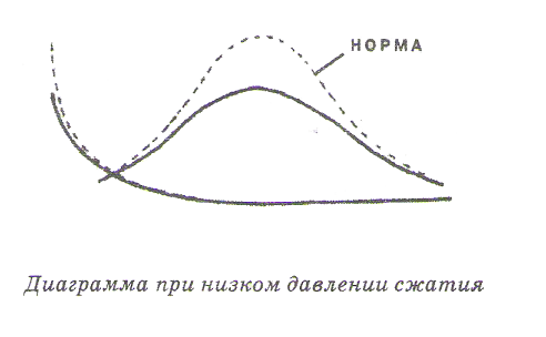 Обнаруживается по заниженным давлениям на диаграмме сжатия. Она может быть также одной из наиболее частых причин неполного сгорания. Низкие давления конца сжатия могут иметь место из-за недостатка продувочного воздуха (неисправность нагнетателя, засорение продувочных окон или впускных клапанов и т.д.), или протечки воздуха мимо поршня в течение такта сжатия, которая может происходить из-за чрезмерного износа или поломки поршневых колец, износа втулки цилиндра, и т.д. Прорыв газов в картер обычно обнаруживается в такте расширения.