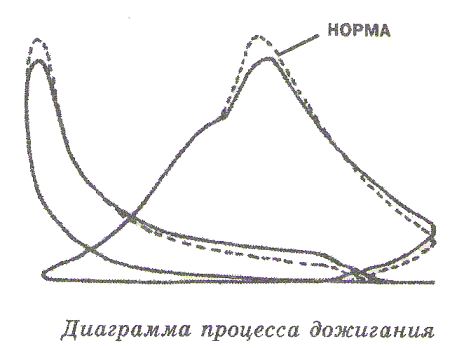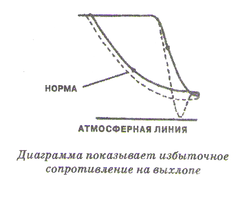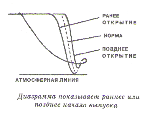 Неполное закрытие выпускного клапана на малых оборотах двигателя может быть обнаружено на индикаторной диаграмме, снятой индикатором со слабой пружиной. При этом диаграмма не дает точного значения фаз газораспределения, однако при сравнении с нормальной диаграммой можно определить, является ли открытие клапана ранним или поздним (см. рис. ниже).