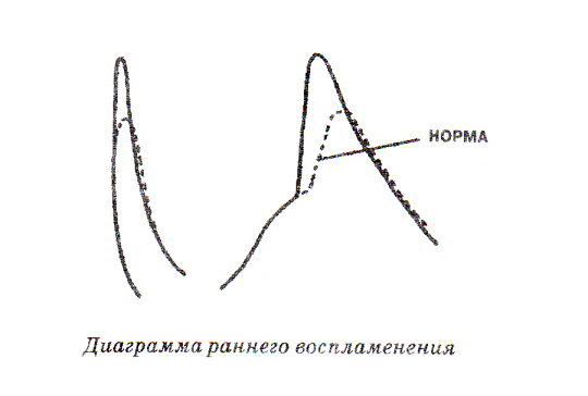 Это нарушение может вызвать ненормально высокий пик давления вблизи ВМТ. Возникающие ударные нагрузки передаются на детали главного движения и подшипники, что вызывает появление стука в двигателе («жесткая» работа). Несмотря на повышение термического КПД и снижение температуры выхлопа, это явление вредное, т.к. повышенные ударные нагрузки и вибрация могут привести к поломке двигателя.