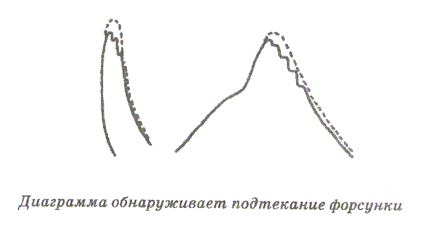 Обнаруживается по потере мощности исследуемого цилиндра, дымному выхлопу и высокой температуре выхлопных газов. Возможны также скачки давления или гидравлические удары в системе топливоподачи. Индикаторная диаграмма, снятая с такого цилиндра, покажет флуктуации давления в процессе расширения, вызванные вторичным воспламенением топлива, подтекающего из неплотной форсунки. Повышенные давления в конце линии расширения указывают также на наличие послесгорания.