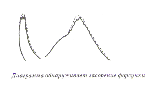 Засорение форсунок может быть вызвано отложением загрязнений, содержащихся в топливе, в тонких каналах и отверстиях распылителя, а также образованием нагара во внутренних полостях при проникновении туда горячих газов из цилиндра через неплотности форсунки. Перегрев соплового наконечника также может вызвать отложение нагара как на внутренних, так и на наружных поверхностях распылителя. Это приводит, прежде всего, к потере мощности двигателя. Засорение трубок, соединяющих топливные насосы и форсунки, может привести даже к разрыву трубок со значительными утечками топлива и возможным серьезным авариям при его воспламенении на горячих поверхностях (например выхлопного коллектора). Обнаружить признаки засорения можно по конфигурации индикаторной диаграммы, а также по снижению температуры выхлопных газов.