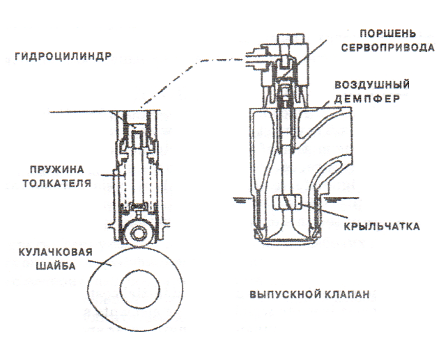 Гидропривод выпускного клапана в настоящее время применяется на большинстве мощных двухтактных судовых дизелей. Штанга, коромысло и толкатель клапана заменяются в этой конструкции одной гидравлической системой. Ролик, связанный с кулачной шайбой распредвала непосредственно давит на поршень масляного насоса высокого давления простого действия. При подъеме поршня масло при высоком давлении вытесняется в магистраль, присоединенную к масляному сервомотору. Давление масла действует на поршень, укрепленный на верхней части шпинделя клапана, вызывая его открытие. Когда выступ кулачной шайбы проходит, спиральная пружина возвращает ролик с поршнем насоса в исходное положение, снижая давление масла и откачивая его из цилиндра сервомотора. Пружина клапана также вытесняет масло из цилиндра сервомотора и одновременно осуществляет закрытие клапана. Система гидропривода постоянно подпитывается маслом из общей системы смазки двигателя, для компенсации возможных утечек в зазорах.