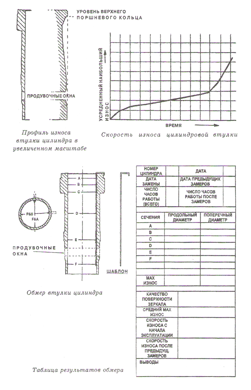 Распределение величины износа по длине цилиндра может отличаться в зависимости от типа двигателя, однако, для двухтактных дизелей простого действия наибольшая величина износа имеет место в верхней части втулки, примыкающей к камере сгорания, где температуры и давления достигают максимальных значений. Износ уменьшается по направлению к нижнему концу втулки, однако опять возрастает в районе продувочных и выпускных окон вследствие увеличенного контактного давления на перемычки окон и разрушения пленки смазки потоком воздуха или выхлопных газов.