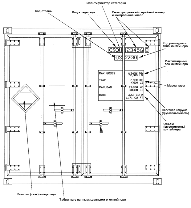 После кодового обозначения владельца следует серийный номер контейнера из шести цифр. Седьмая цифра, так называемое контрольное число, служит для проверки правильности информации о коде владельца и серийном номере контейнера. Это число рассчитывается по установленному правилу. При исключении любой буквы или цифры из кода и номера контейнера (например, после ремонта) будет иметь место несовпадение контрольного числа. Вторая строка маркировочного кода также состоит из двух частей буквенной и цифровой. Буквенная часть содержит две прописные (в некоторых случаях – три) буквы латинского алфавита, составляющие кодовое обозначение страны владельца контейнера (закодированное в первой строке маркировочного кода).