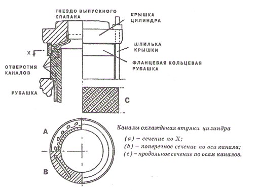 Охлаждение рубашечного типа осуществляется путем циркуляции охлаждающей пресной воды в пространстве между наружной поверхностью втулки и внутренней поверхностью рубашки или блока цилиндров («зарубашечном» пространстве). Водяное пространство должно быть продолжено за пределы верхнего торца втулки. Для уплотнения нижней части втулки применяют кольца из силиконовой резины, которые вставляются в пазы наружной поверхности втулки, позволяя ей свободно расширяться при повышении температуры. Верхний конец уплотняется по посадочной поверхности фланцевой части.