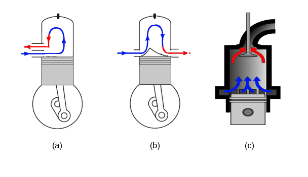 (с) Прямоточная продувка – воздух движется вверх сплошным потоком по всему сечению цилиндра, вытесняя газы через выпускной клапан или выхлопные окна в верхней части цилиндра.