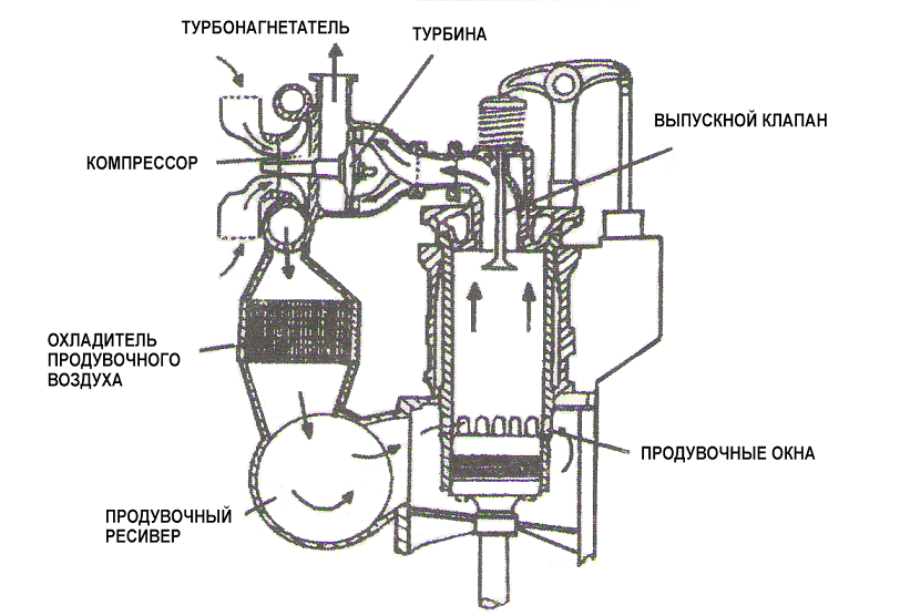 Выхлопные газы из цилиндра направляются в газовую турбину, где они отдают часть своей тепловой энергии. Турбина насажена на общий вал с воздушным компрессором, который засасывает атмосферный воздух, сжимает его и подает через воздухоохладитель к продувочным окнам цилиндра двигателя.