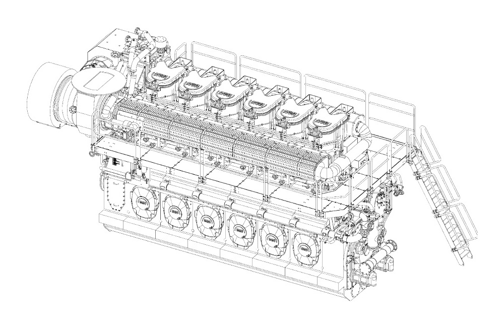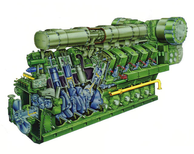 Двигатель MAN-B&W L58/64. Как следует из обозначения, это один из мощных среднеоборотных 4-хтактных дизелей, с диаметром цилиндра 580 мм, ходом поршня 640 мм, рядной конструкции. Он может успешно конкурировать с аналогичными малооборотными двигателями эффективной работой на тяжелых топливах, легкостью обслуживания с длительными межремонтными интервалами. Это преимущество существенно при обслуживании ССУ сокращенным экипажем.