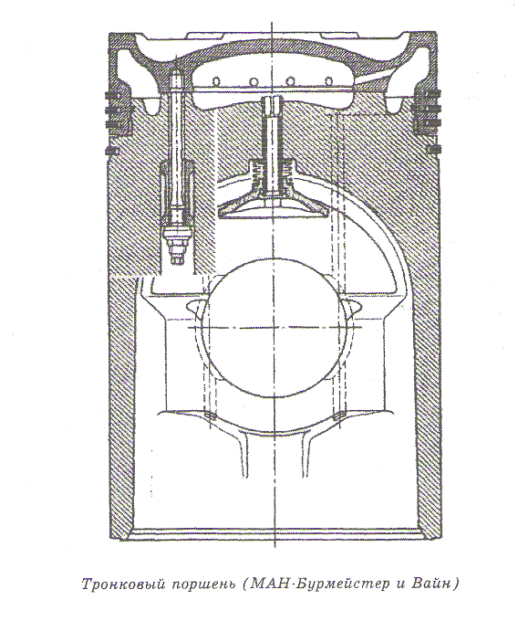 Поршни такого типа применяются практически на всех современных четырехтактных дизелях, и размеры их могут изменяться от минимальных для маломощных высокооборотных двигателей до 600 мм для мощных среднеоборотных машин.